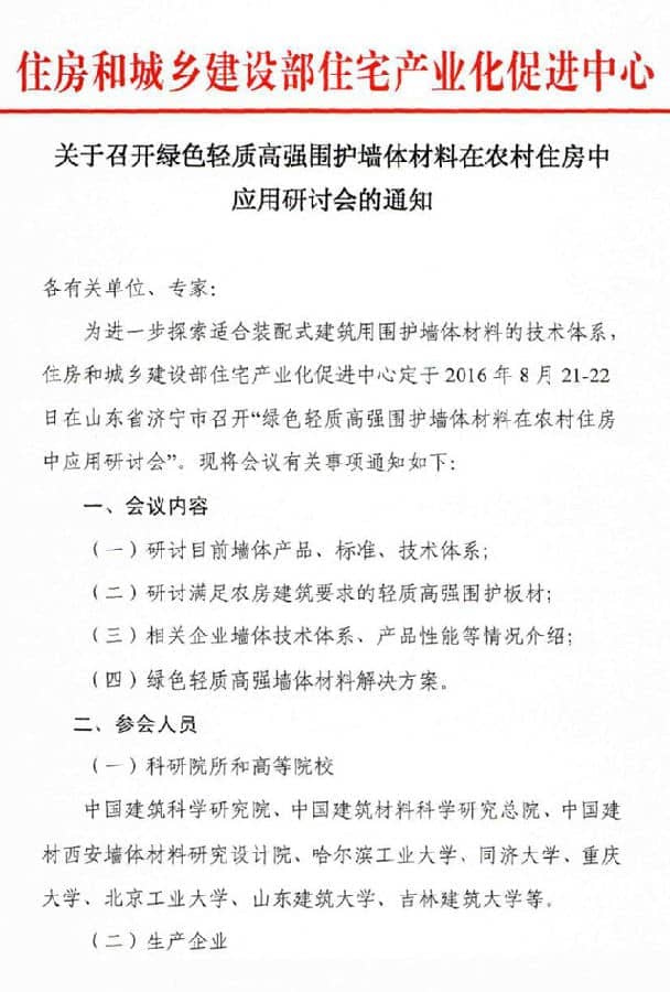 為進一步探索適合裝配式建筑用圍護墻體材料的技術(shù)體系,住房和城鄉(xiāng)建設(shè)部住宅產(chǎn)業(yè)化促進中心定于2016年8月21-22日在山東濟寧市兗州區(qū)召開“綠色輕質(zhì)高強圍護墻體材料在農(nóng)村住房中應(yīng)用研討會”。