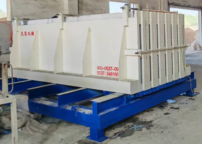 工作原理:模具的開合由下方的液壓機構完成,和墻板機類似。合模后的鎖緊由上方和兩端的拉桿裝置實現(xiàn)。下方的強制同步裝置保證了大板在開合時的兩側同步。大板下方的輪組保證了大板在開合時不傾斜、不倒伏。