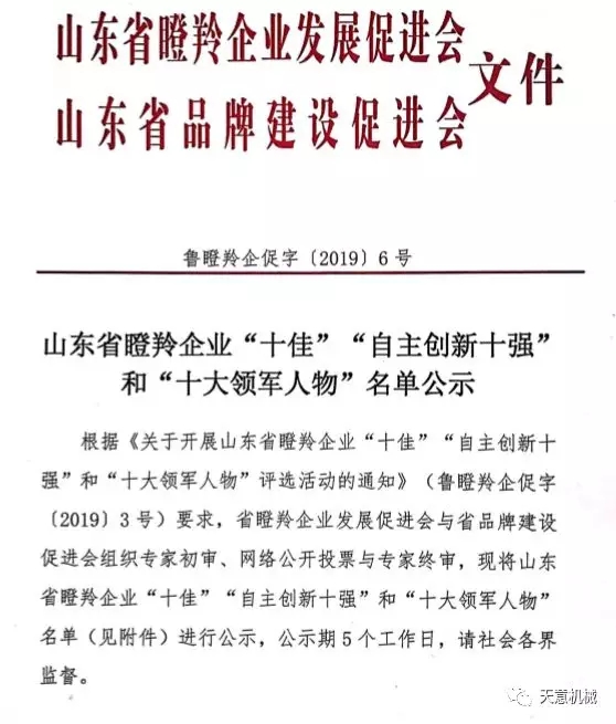 根據(jù)《關(guān)于開(kāi)展山東省瞪羚企業(yè)十佳”“自主創(chuàng)新十強(qiáng)十大領(lǐng)軍人物評(píng)選活動(dòng)的通知》(魯?shù)闪缙蟠僮帧?/span>20193號(hào))要求,2019126日,山東省瞪羚企業(yè)發(fā)展促進(jìn)會(huì)、山東省品牌建設(shè)促進(jìn)會(huì)發(fā)布魯?shù)闪缙蟠僮?/span>[2019]6號(hào)文,公布經(jīng)過(guò)專家初審、網(wǎng)絡(luò)公開(kāi)投票與專家終審,評(píng)選出了山東省瞪羚企業(yè)十佳自主創(chuàng)新十強(qiáng)十大領(lǐng)軍人物。天意機(jī)械榮獲“山東省十佳瞪羚企業(yè)”稱號(hào)。